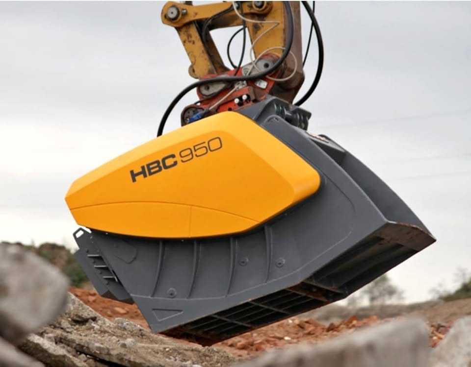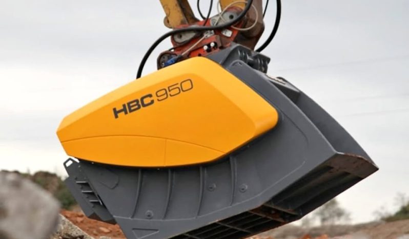 Adicionalmente, hay referencias a manuales y piezas como la placa de acople (connection plate) para la HBC 950. La cuchara está indicada para excavadoras grandes (más de 22t) con capacidad hidráulica para su operación.